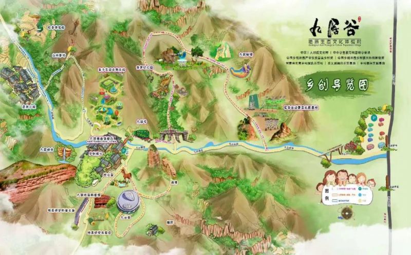 依托獨特的丹霞地質、地貌優勢和淳樸的鄉土風情,以“地質觀園、康養福地”為總體定位。堅持“地質為基、文化為魂、融合為要、惠民為本”的基本原則,將九居谷地質文化村內部地質資源、景觀、產業、村莊等元素統一整合,綜合集成旅游觀光、生態涵養、歷史文化、文化創意、科普教育等內容,建成形式多樣、產業融合、特色鮮明的谷域產業經濟帶,從而達到促進經濟、社會、環境等綜合效應的一種發展形態。以“地質+旅游”“地質+教育”“地質+康養”“地質+生態”等綜合服務的文化模式建設發展。